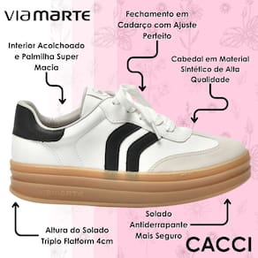 O tênis Via Marte é a escolha perfeita para quem busca estilo, conforto e um visual único. Seu solado triplo em flatform de 4cm proporciona estabilidade e conforto durante a caminhada. O design moderno é cuidadosamente elaborado, com costuras detalhadas que garantem um charme diferenciado.
