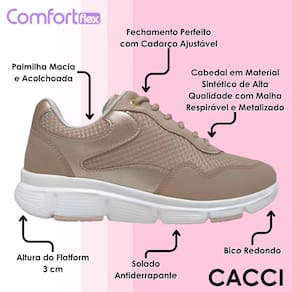 Este tênis feminino Comfortflex é a escolha certa para quem valoriza conforto, respirabilidade e design moderno no dia a dia. O cabedal é confeccionado em material sintético de alta qualidade com acabamento em malha respirável e variações com detalhes metalizados, garantindo frescor e charme em cada passo. O fechamento com cadarço ajustável proporciona ajuste ideal ao formato dos pés, oferecendo praticidade e segurança durante o uso prolongado.