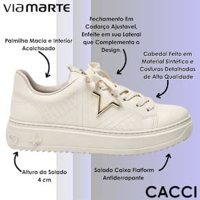 O tênis Via Marte é a escolha perfeita para quem busca estilo, conforto e um visual único. Seu solado Flatform proporciona estabilidade e conforto durante a caminhada. Seu design moderno e cuidadosamente elaborado, com costuras detalhadas, garante um charme diferenciado. Conta também com um belo enfeite em sua lateral que complementa o design único do tênis. Além disso, o interior acolchoado e os materiais de alta qualidade asseguram o máximo conforto aos seus pés. O tênis Via Marte é a opção versátil e elegante que oferece estilo e bem-estar em todas as ocasiões.