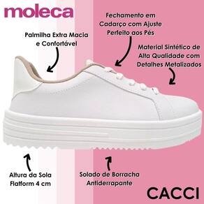 Para quem valoriza conforto sem abrir mão do estilo, o Tênis Moleca é a escolha ideal para o dia a dia. Com um visual moderno e discreto, ele combina com tudo e traz aquele toque versátil que se adapta facilmente a diferentes ocasiões. Seu acabamento em material de alta qualidade, com detalhes discretamente metalizados, dá ao modelo uma aparência sofisticada, mantendo a leveza e praticidade que a rotina pede. É aquele tipo de calçado que você pode usar com jeans, saias, vestidos ou peças mais casuais, sempre garantindo um look atual e descomplicado.