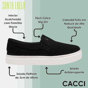 O modelo slip on proporciona praticidade, sendo fácil de calçar e garantindo um ajuste perfeito aos pés. Perfeito para quem busca agilidade e conforto, sem perder o charme e a elegância.