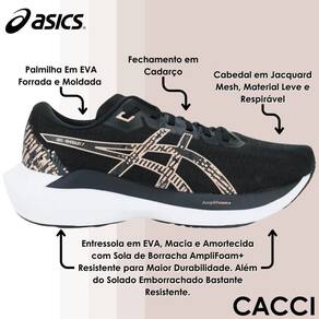 A tecnologia GEL™ da Asics, presente desde 1986, é focada na absorção de impacto nas áreas de maior carga, como calcanhar e dedão, protegendo o corpo e reduzindo a fadiga muscular. A entressola em EVA, feita de etileno, vinil e acetato, oferece excelente amortecimento e conforto, sendo durável e responsiva em cada passo. Juntas, essas tecnologias garantem conforto, proteção e desempenho durante as corridas.