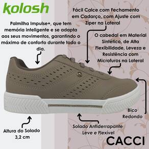 Sinta a leveza e o conforto a cada passo com a palmilha Impulse+, que tem memória inteligente e se adapta aos seus movimentos, garantindo o máximo de conforto durante todo o dia. Além disso, o calce fácil com elástico sobre o pé, otimiza o seu tempo e facilita o uso. A sola caixa de 3,2 cm, já consagrada pela marca Kolosh, oferece amortecimento e estabilidade, perfeita para você aproveitar cada momento.
