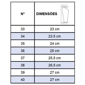 Recomendações de Uso: A limpeza do calçado pode ser feita com Detergente neutro e pano úmido. Não deixar submerso em água e não utilizar nenhuma forma de calor para secar. Guardar em local sem umidade.