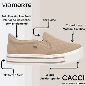 O Tênis Slip On Via Marte Feminino 2210209 é um modelinho cheio de estilo, conforto e casualidade. É uma ótima opção para se usar tanto no dia a dia quanto em passeios aos finais de semana. Seu design apresenta ajuste elástico nas laterais, palmilha removível em espuma e solado plataforma em PVC medindo 3,5 cm. Viva o estilo com Via marte!