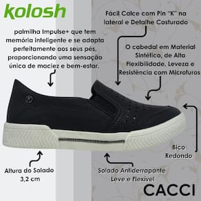 Sinta a leveza a cada passo com a palmilha Impulse+ que tem memória inteligente e se adapta perfeitamente aos seus pés, proporcionando uma sensação única de maciez e bem-estar. Além disso, o calce fácil com elásticos nas laterais otimiza o seu tempo e facilita o calce, perfeito para quem busca praticidade no dia a dia. Já a sola caixa com 3,2 cm, consagrada pela marca Kolosh, oferece amortecimento e estabilidade, garantindo segurança e conforto em cada pisada.