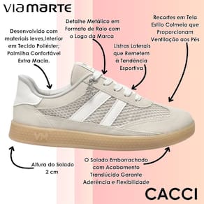 Esse modelo da Via Marte é perfeito para quem busca estilo e conforto no dia a dia. Ele foi desenvolvido com materiais leves e conta com interior em tecido poliéster e palmilha macia que proporciona sensação agradável durante o uso. Possui recortes em tela estilo colmeia que favorecem a ventilação dos pés, mantendo a respirabilidade mesmo em longos períodos.