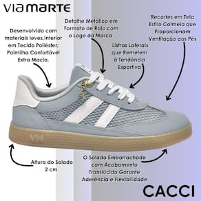 Esse modelo da Via Marte é perfeito para quem busca estilo e conforto no dia a dia. Ele foi desenvolvido com materiais leves e conta com interior em tecido poliéster e palmilha macia que proporciona sensação agradável durante o uso. Possui recortes em tela estilo colmeia que favorecem a ventilação dos pés, mantendo a respirabilidade mesmo em longos períodos.