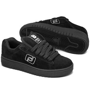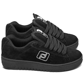 Cabedal em camurça premium resistente Forro interno acolchoado em tecido poliéster Palmilha em EVA termo moldado com memória Solado de borracha vulcanizada com costura reforçada Cadarço tradicional em algodão para ajuste firme Visual minimalista preto, fácil de combinar Estilo skateshoe versátil para looks urbanos e casuais