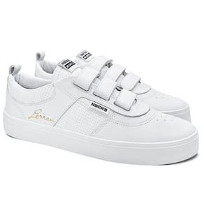 Com cabedal em couro branco natural e sintético PVC perfurado, o modelo traz a assinatura de Lorran Freitas em dourado, dando um toque exclusivo. As tiras auto colante substituem os cadarços, oferecendo mais praticidade e um ajuste anatômico que mantém o pé firme e confortável. A lingueta foi atualizada para garantir maior firmeza e prolongar o uso do tênis. O solado RubberMax, feito com borracha natural de alta densidade, proporciona excelente aderência e durabilidade, enquanto a palmilha FlexForm em P.U termo conformada oferece conforto e maior vida útil ao calçado.