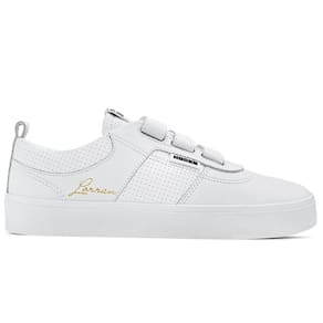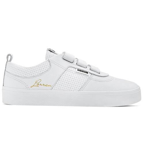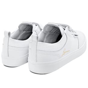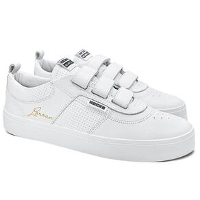 Com cabedal em couro branco natural e sintético PVC perfurado, o modelo traz a assinatura de Lorran Freitas em dourado, dando um toque exclusivo. As tiras auto colante substituem os cadarços, oferecendo mais praticidade e um ajuste anatômico que mantém o pé firme e confortável. A lingueta foi atualizada para garantir maior firmeza e prolongar o uso do tênis. O solado RubberMax, feito com borracha natural de alta densidade, proporciona excelente aderência e durabilidade, enquanto a palmilha FlexForm em P.U termo conformada oferece conforto e maior vida útil ao calçado.
