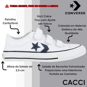O clássico Converse Star Player chega em sua versão kids, trazendo o charme do estilo vintage com toda a praticidade necessária para o dia a dia. Confeccionado em tecido de algodão tipo lona, oferece durabilidade com costuras duplas no cabedal, garantindo mais resistência para acompanhar as aventuras dos pequenos. O forro interno acolchoado proporciona conforto extra, enquanto as três tiras ajustáveis no cabedal tornam o fechamento rápido e seguro. O icônico logo Converse All Star aparece na heeltab do calcanhar e na tag da língua, enquanto o tradicional Star Chevron nas laterais reforça a identidade autêntica da marca. Para completar, o solado vulcanizado garante aderência e estabilidade em cada passo, unindo estilo, conforto e funcionalidade em um só modelo.