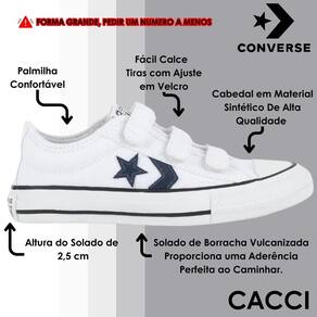 O clássico Converse Star Player chega em sua versão kids, trazendo o charme do estilo vintage com toda a praticidade necessária para o dia a dia. Confeccionado em tecido de algodão tipo lona, oferece durabilidade com costuras duplas no cabedal, garantindo mais resistência para acompanhar as aventuras dos pequenos. O forro interno acolchoado proporciona conforto extra, enquanto as três tiras ajustáveis no cabedal tornam o fechamento rápido e seguro. O icônico logo Converse All Star aparece na heeltab do calcanhar e na tag da língua, enquanto o tradicional Star Chevron nas laterais reforça a identidade autêntica da marca. Para completar, o solado vulcanizado garante aderência e estabilidade em cada passo, unindo estilo, conforto e funcionalidade em um só modelo.