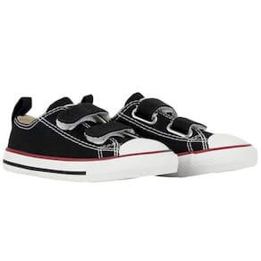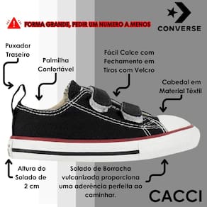 O clássico Chuck Taylor All Star nesta versão kids é confeccionado em tecido lona de algodão e vem em diversas cores. O tênis possui duas tiras colantes na parte superior para fechar e puxador traseiro para facilitar o calçar.