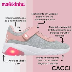 O tênis de menina da marca Molekinha é um verdadeiro encanto, repleto de detalhes que vão fascinar as pequenas princesas. Seu cabedal é todo adornado em brilho, conferindo um visual deslumbrante e cheio de glamour. Os cadarços em elástico e a Tira Alto Colante garantem um calce prático e seguro, facilitando o dia a dia. Além de sua beleza impressionante, o tênis oferece um conforto excepcional, perfeito para o uso prolongado. Para completar, o solado possui luzes de LED na parte posterior, adicionando um toque mágico e divertido que encantará ainda mais as meninas.