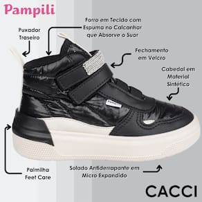 Cano médio com forro interno em tecido que auxilia na absorção do suor e espuma comfy no calcanhar. Palmilha Feet Care que possui um sistema avançado de fofura. Calce fácil com fechamento em tira aderente, facilitando a rotina da menina.