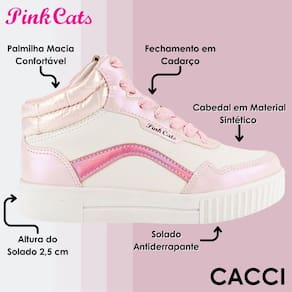 Os detalhes das cores metalizadas e com efeito holográfico são o destaque do modelo, e garantem um toque de glamour e sofisticação. O material sintético de alta qualidade garante durabilidade e conforto para os pés das meninas. Leve e fácil de combinar com diversos looks, o Tênis Pink Cats Infantil de Cano Alto vai ser o novo queridinho das fashionistas!