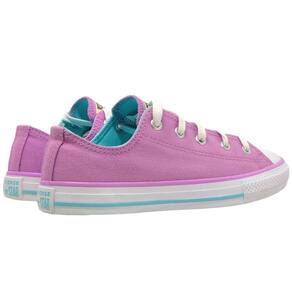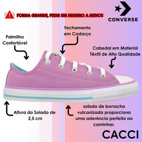 O clássico Chuck Taylor All Star na versão kids é confeccionado em tecido canvas de algodão tipo lona e vem nesta edição em cores sazonais. Nesta temporada, as cores da tendência escolhidas para compor a coleção, trazem o sentimento de calma, estabilidade e esperança. Possui costuras duplas, uma tira de tecido no calcanhar que proporciona maior suporte ao tênis e ilhoses na cor prateada, com dois ilhoses laterais para uma transpiração adequada aos pés. A tag com a logo Chuck Taylor All Star aparece em um degradê de cores e é aplicado na língua, enquanto a heeltab é aplicada no calcanhar. O solado vulcanizado garante a aderência adequada ao caminhar.