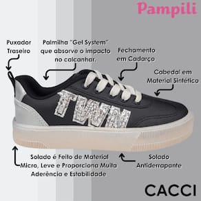 Tênis feminino em sintético preto, com recorte em glitter flocado prata TWN bordado na lateral e pintura degradê metalizada no solado, inovador e descolado para as meninas arrasarem nos rolês. Tênis com forro interno que ajuda a absorver o suor e espuma macia no calcanhar para maior conforto. A palmilha conta com o sistema "Gel System" que absorve o impacto no calcanhar. O fechamento é em cadarço, possibilitando diversas amarrações. O solado é feito de material micro, leve e proporciona muita aderência e estabilidade, além de ser flexível, resistente a temperaturas e ter alto desempenho antiderrapante.