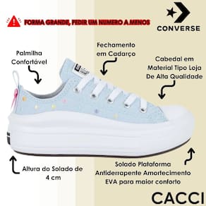 O icônico Chuck Taylor All Star ganha um toque lúdico e encantador na versão kids da coleção Polka Dots, trazendo um visual divertido e cheio de personalidade para os pequenos. Seu cabedal em algodão tipo lona recebe bordados coloridos de poá, combinando charme e estilo em cada detalhe. As costuras duplas garantem maior resistência, enquanto o delicado lacinho de fita na tira de suporte do calcanhar adiciona um toque especial ao design. Para proporcionar mais conforto, o modelo conta com forro interno acolchoado e dois ilhoses laterais que permitem uma ventilação adequada aos pés. A assinatura Converse All Star aparece na Heel Logo, aplicada na entressola na altura do calcanhar, reforçando sua autenticidade. O conforto fica ainda mais evidente com a palmilha em PU feita com Die-Cut, unida ao solado plataforma estilo cupsole, produzido em EVA, que possui aproximadamente 3 cm de altura (podendo variar conforme o tamanho), garantindo leveza e um caminhar repleto de estilo e comodidade.