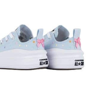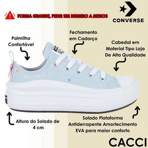 O icônico Chuck Taylor All Star ganha um toque lúdico e encantador na versão kids da coleção Polka Dots, trazendo um visual divertido e cheio de personalidade para os pequenos. Seu cabedal em algodão tipo lona recebe bordados coloridos de poá, combinando charme e estilo em cada detalhe. As costuras duplas garantem maior resistência, enquanto o delicado lacinho de fita na tira de suporte do calcanhar adiciona um toque especial ao design. Para proporcionar mais conforto, o modelo conta com forro interno acolchoado e dois ilhoses laterais que permitem uma ventilação adequada aos pés. A assinatura Converse All Star aparece na Heel Logo, aplicada na entressola na altura do calcanhar, reforçando sua autenticidade. O conforto fica ainda mais evidente com a palmilha em PU feita com Die-Cut, unida ao solado plataforma estilo cupsole, produzido em EVA, que possui aproximadamente 3 cm de altura (podendo variar conforme o tamanho), garantindo leveza e um caminhar repleto de estilo e comodidade.