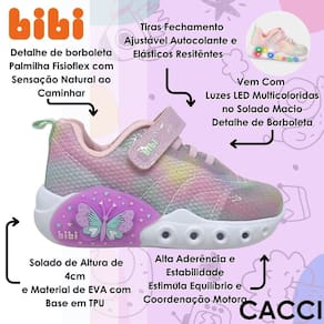 O Tênis Bibi Fun Light foi desenvolvido para transformar cada passo em um momento encantador. Com luzes multicoloridas que acendem ao caminhar, ele traz mais alegria e criatividade para o dia a dia das meninas. Seu design moderno e delicado com detalhe de borboleta torna o visual ainda mais especial. Leve, flexível e confortável, é ideal para acompanhar a rotina ativa infantil com segurança, liberdade de movimentos e ajuste prático.
