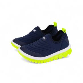 Design Dinâmico e Vibrante: O solado com design exclusivo oferece uma sensação de movimento constante, estimulando a criatividade e a energia das crianças, com um visual moderno em azul naval e amarelo.