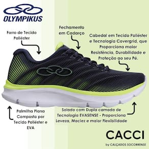 TECNOLOGIAS: COVER GRID- A tecnologia da Olympikus com aplicação em PU emborrachado que proporciona mais resistência ao cabedal. EVASENSE - A tecnologia da Olympikus em EVA para máxima maciez e conforto absoluto.