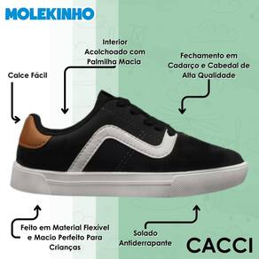 O Tênis Molekinho foi feito para os pequenos que não abrem mão de estilo e conforto em qualquer ocasião. Com design moderno e cheio de personalidade, esse modelo traz praticidade no dia a dia e combina com os mais variados looks, deixando o visual dos meninos ainda mais descolado.