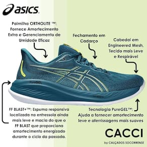 FF BLAST+™: Espuma responsiva localizada na entressola ainda mais leve e macia do que o FF BLAST que proporciona amortecimento energizado durante o ciclo da passada. Palmilha Ortholite X-30™ A palmilha ORTHOLITE ™ fornece amortecimento extra e gerenciamento de umidade eficaz, em versão atualizada X-30. Benefícios: respirabilidade e conforto. Pure GEL ™ A nova versão da nossa tecnologia tradicional GEL, agora mais macio, qual mantém as mesmas propriedades , porém na sua forma mais pura , jamais criada. Atualmente 65% mais leve que a versão anterior, a tecnologia em está localizada principalmente nas áreas de maior carga no momento do impacto. Benefícios: Absorção do impacto, proteção e conforto.