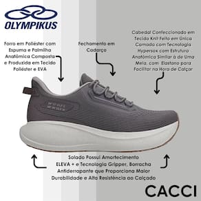 Tecnologias: Hypersox - A tecnologia da Olympikus em formato de meia, leve e flexível. Fácil de calçar e com ajuste perfeito ao pé. Eleva + -Tecnologia exclusiva Olympikus, que explora o limite de expansão do EVA para alcançar máxima resposta. Este EVA é leve e de baixa densidade, garantindo menor deformação e mantendo o conforto e a durabilidade.Gripper -Borracha antiderrapante que garante melhor aderência