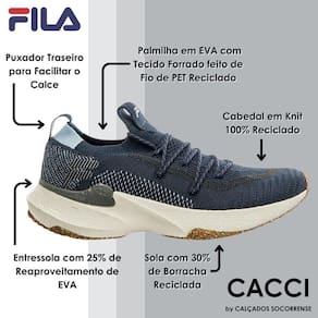 O Tênis Fila Float Saving Change the Future é produzido por meio do reaproveitamento de materiais utilizados na fabricação de calçados, de acordo com a proposta sustentável "Design out Waste". O modelo traz conforto para os treinos, além de foco na sustentabilidade: cabedal em Knit 100% reciclado; palmilha em EVA com tecido forrado feito de fio de PET reciclado; entressola com 25% de reaproveitamento de EVA e sola com 30% de borracha reciclada.
