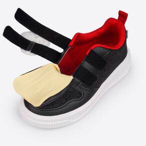 - Tiras frontais com escrita em braile “Mickey e Minnie em cada pé” e patche removível.