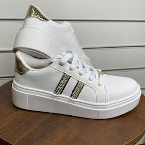 Tênis Vizzano em sintético, possui sola alta com 4cm, detalhe em croco dourado no calcanhar, duas tira lateral em metalizado dourado com aplicação de cristais. Possui palmilha conforto e interior forrado com espuma e textil macio que garante uma pisada maravilhosa, você não vai querer retirar mais dos pés.