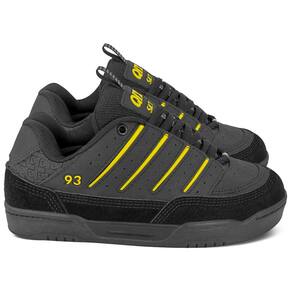 Cabedal em material sintético resistente: Acabamento em preto com detalhes amarelos que valorizam o design.