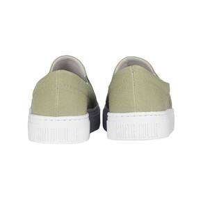 Tênis slip on preto, confeccionado em material lona sol. Este modelo é caracterizado pelo solado emborrachado branco, bico arredondado e elásticos nas laterais para facilitar o ajuste ao calçar.