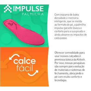 Com espuma de baixa densidade e memória inteligente, que se molda ao formato do pé, a palmilha impulse garante leveza e conforto para a sua pisada e ainda absorve os impactos de cada passo.