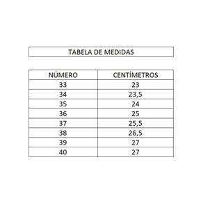 Recomendações de Uso: A limpeza do calçado pode ser feita com sabão neutro e pano úmido. Não deixar submerso em água e não utilizar nenhuma forma de calor para secar. Guardar em local sem umidade.