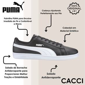 O modelo com design casual e moderno, possui cabedal em poliéster, fechamento em cadarço, solado emborrachado e resistente e logo Puma aplicado na lateral.