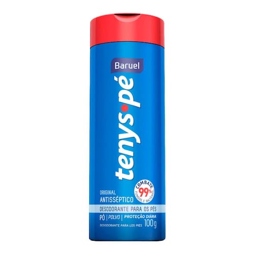 TENYS PÉ BARUEL TALCO Pó. Desodorante para os pés com ação antisséptica que combate 99% de fungos e bactérias, mantendo-os sempre secos e protegidos. Pode ser aplicado nos pés e/ou nos calçados. Comba Ean: 7896020160052
