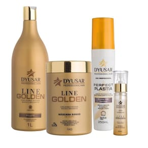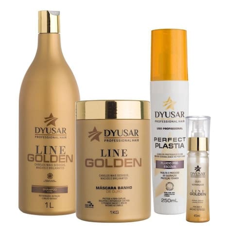 O kit contém: 01 shampoo ouro dyusar line golden 1 litro 01 máscara banho de ouro dyusar line golden 1kg 01 óleo reparador dyusar line golden 45ml 01 fluido pre- escova perfect plastia 250ml