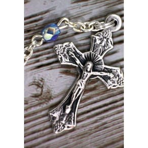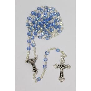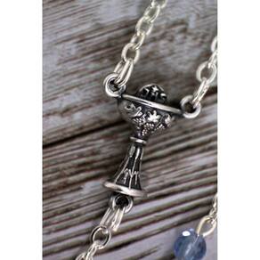 Este lindo terço Italiano, apresenta contas azul de cristal. Sua peça central de Cálice da Eucaristia. O colar é folheado de prata oxidada, assim como o crucifixo lindamente detalhado. Mede aproximadamente 37 centímetros. Marca: San Gregorio - Artigos Religiosos