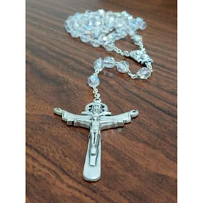 Este lindo terço é feito de contas facetadas redondas branca de 7 mm de vidro de cristal transparente lapidada, sua peça central apresenta Nossa Senhora e o Menino Jesus na frente, e o Sagrado Coração de Jesus no verso e um Crucifixo da Santíssima Trindade. Na parte de trás do crucifixo estão as palavras "Tertium Millennium", que celebra o martírio. O milênio de Tertium é o terceiro milênio depois de Cristo. Este crucifixo é fundido e oxidado com prata para um melhor acabamento. Com cerca de 52 cm de altura. Marca: San Gregorio - Artigos Religiosos