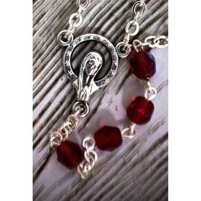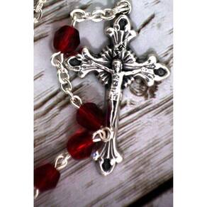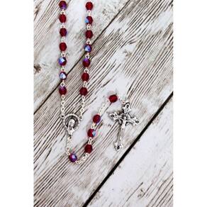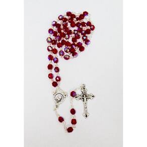 Este lindo rosário é feito de contas facetadas de 5 mm vermelho de vidro de cristal. A peça central apresenta Nossa Senhora na frente e o Sagrado Coração de Jesus nas costas. É oxidado pela prata, assim como o crucifixo de estilo bizantino. Mede 37 cm do centro das contas até a ponta do crucifixo. Fabricado na Itália. Marca: San Gregorio - Artigos Religiosos