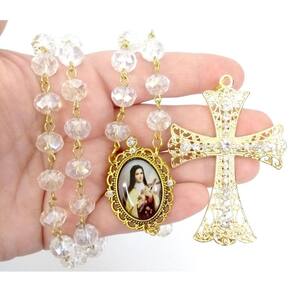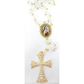 Terço de Noiva confeccionado manualmente com cristais boreais de vidro importados de 10mm. Cruz Banhada a Ouro cravejada com strass medindo 8,0 cm de altura e 5,5 cm de largura Entremeio Banhado a Ouro resinado de Santa Terezinha do Menino Jesus. Medida do entremeio: 30mm x 40mm / área da foto: 18mm x 25mm. O terço mede aproximadamente 75 cm, lindo e delicado. O terço é acomodado em uma fina caixa de veludo.