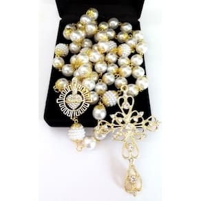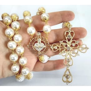 Terço de Noiva confeccionado manualmente com pérolas brancas ABS de 12mm, não descascam e não deformam. Cada pérola é apoiada por tulipas tridimensionais com banho de ouro e os Pai-Nossos são confeccionados com pérolas framboesas de 14mm revestidas com tulipas duplas. Cruz Banhada a Ouro cravejada de Strass medindo 8,5 cm de altura e 5,5 cm de largura. Entremeio do Sagrado Coração de Jesus Banhado a Ouro cravejado com Strass. Medida do terço esticado: 80 cm aproximadamente . O terço é acomodado em uma fina caixa de veludo. Marca: Evangelize Ean: 7898164183461