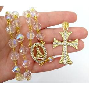 Terço de Noiva confeccionado manualmente com cristais boreais tchecos de 10mm, não descascam e não deformam. Cada cristal é apoiado por tulipas e os Pai-Nossos revestidos com tulipas duplas. Cruz Banhada a ouro cravejada de Strass medindo 5,0 cm de altura e 3,0 cm de largura. Entremeio de Nossa Senhora Aparecida com Strass. Medida do terço esticado: 60 cm aproximadamente. O terço é acomodado em uma fina caixa de veludo. Marca: Evangelize