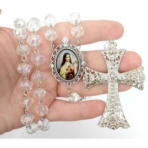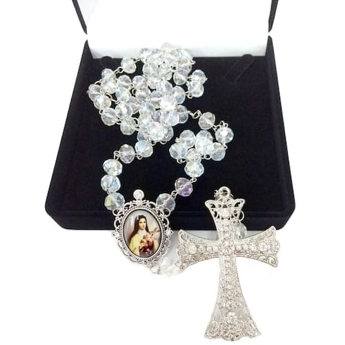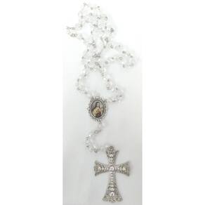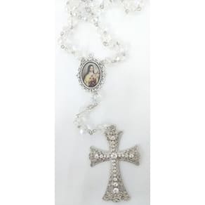 Terço de Noiva confeccionado manualmente com cristais boreais de vidro importados de 10mm. Cruz Prata cravejada com strass medindo 8,0 cm de altura e 5,5 cm de largura Entremeio Prata resinado de Santa Terezinha do Menino Jesus. Medida do entremeio: 30mm x 40mm / área da foto: 18mm x 25mm. O terço mede aproximadamente 75 cm, lindo e delicado. O terço é acomodado em uma fina caixa de veludo. Marca: Evangelize