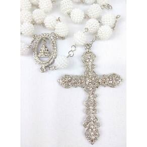 Terço de Noiva confeccionado com pérolas brancas framboesa ABS de 12mm, não descascam e não deformam. Cruz Prata cravejada com Strass Preciosa medindo 8,0 cm de altura e 5,5 cm de largura. Entremeio de Nossa Senhora Aparecida cravejada com Strass Preciosa medindo 3,5 cm de altura e 2,3 cm de largura. A medida do terço esticado é de aproximadamente 73 cm. O terço é acomodado em uma fina caixa de veludo. Marca: Não Informado