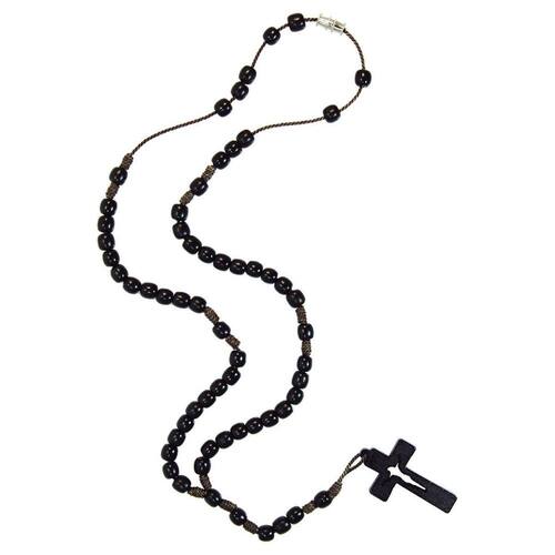 Terço de pescoço em madeira com fecho Terço de pescoço em madeira, na cor preta. Fecho estilo rosca e cruz vazada. - O Terço é uma das devoções mais queridas de Nossa Senhora. Aparecendo em Fátima, ela pediu aos pastorezinhos: Meus Filhos, rezemos o terço todos os dias.